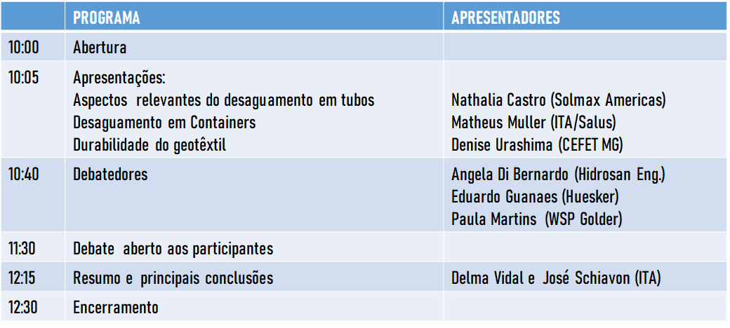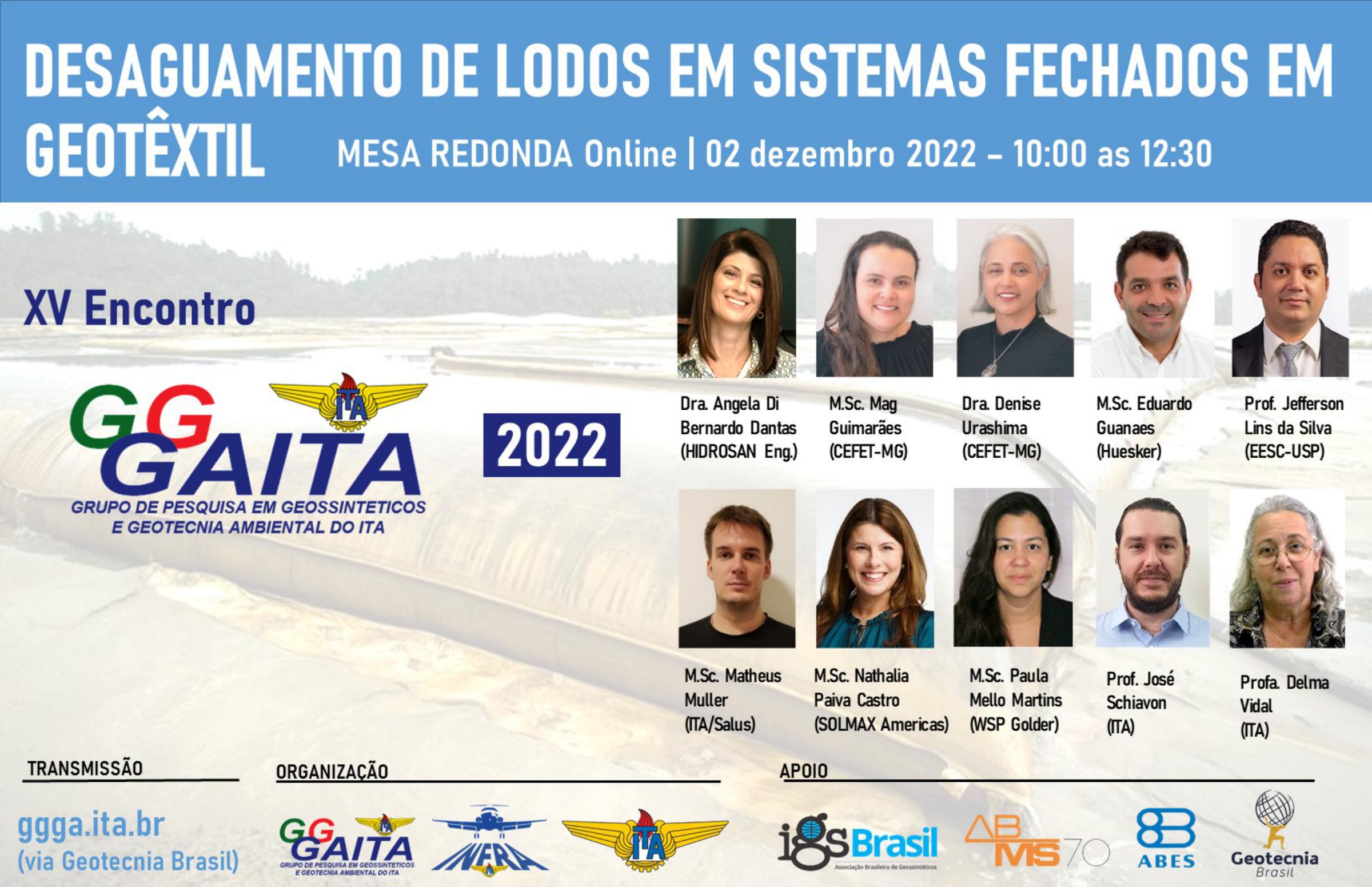 Este ano o Encontro Técnico Anual do Grupo de Pesquisa em Geossintéticos e Geotecnia Ambiental do ITA celebra 36 anos de atividades do Laboratório de Geossintéticos e Geotecnia Ambiental do ITA. O evento acontece no dia 02 de dezembro de 2022 e será inteiramente online. Especialistas da Indústria, Projetistas e Pesquisadores serão convidados para apresentar casos da vivência prática de Engenharia. Em seguida, os Especialistas no tema serão convidados a compor a mesa para expor suas considerações e debater sobre os aspectos relevantes do tema. Ao final, o debate será aberto ao público que poderá perguntar e comentar os aspectos discutidos diretamente pelo chat da página de transmissão.