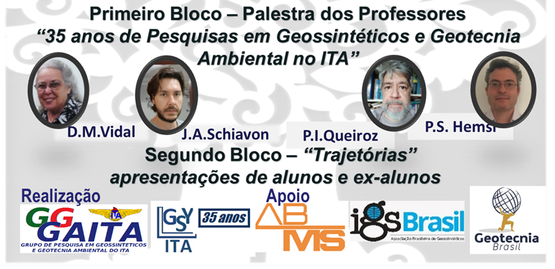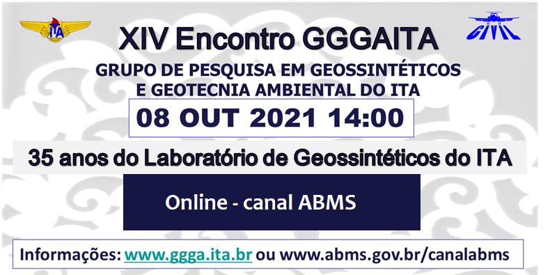 Este ano o Encontro Técnico Anual do Grupo de Pesquisa em Geossintéticos e Geotecnia Ambiental do ITA celebra 35 anos de atividades do Laboratório de Geossintéticos e Geotecnia Ambiental do ITA. O evento acontece no dia 08 de outubro de 2021 e será inteiramente online. Serão apresentados casos da vivência prática de Engenharia dos membros do GGGAITA egressos da Pós-Graduação da Infra-ITA, além da apresentação das pesquisas realizadas nas áreas de Geossintéticos e Geotecnia Ambiental ao longo da história do grupo do grupo.