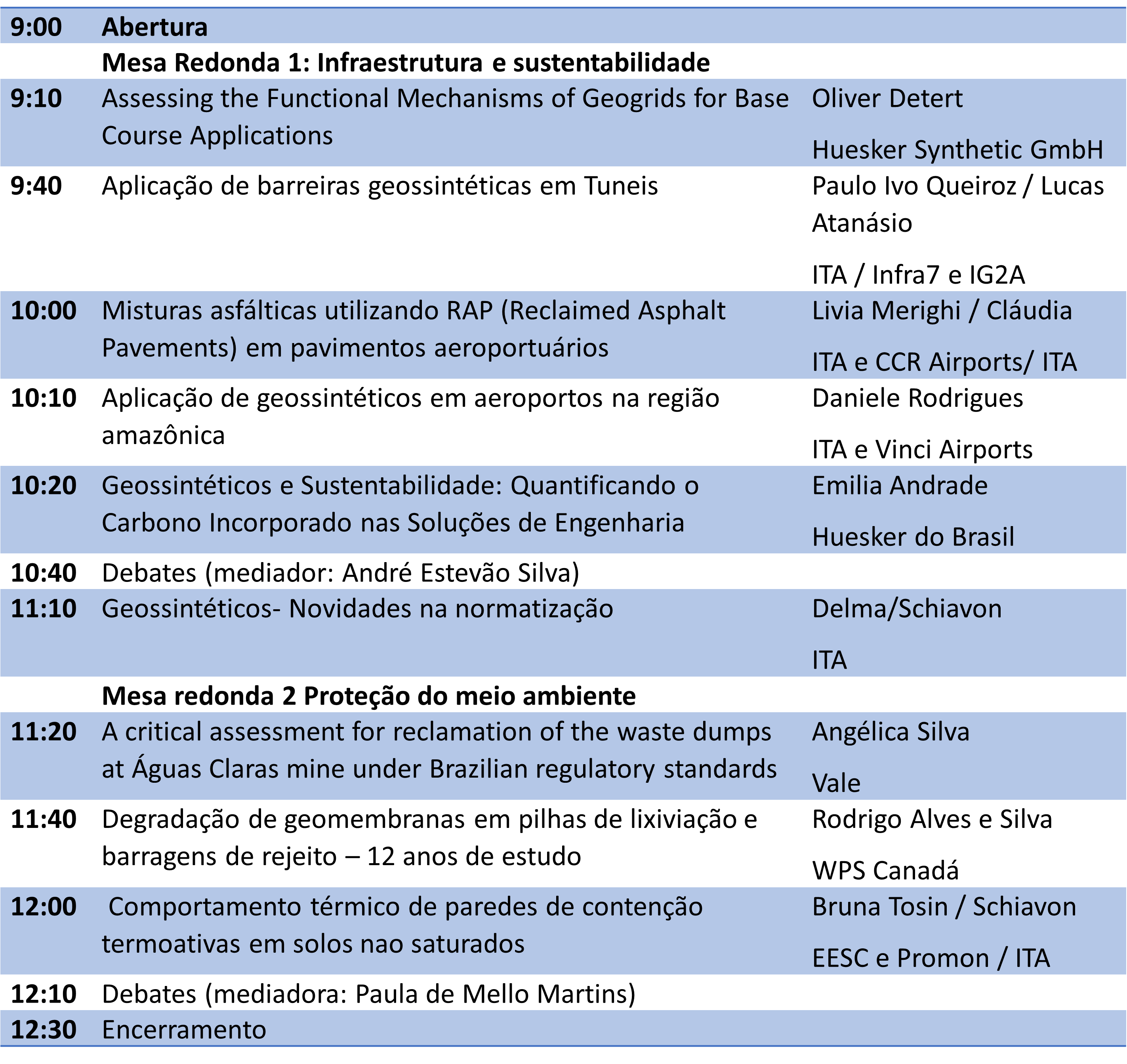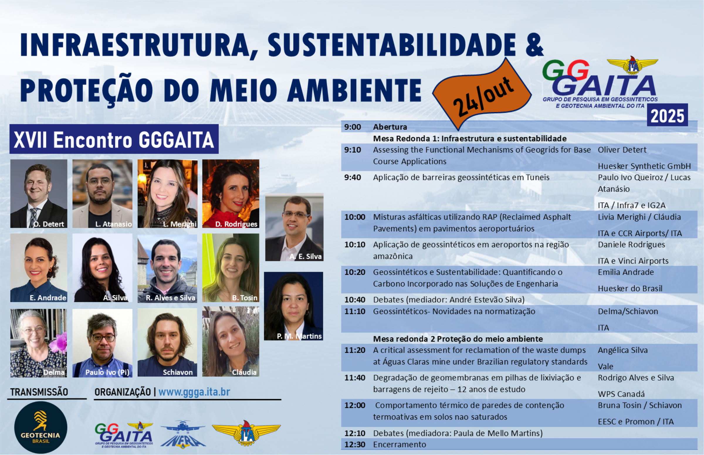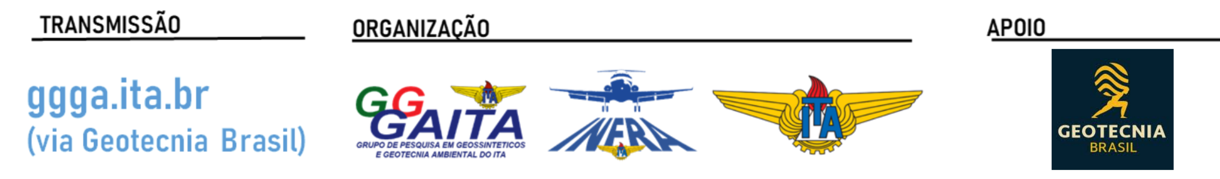 Este ano o Encontro Técnico Anual do Grupo de Pesquisa em Geossintéticos e Geotecnia Ambiental do ITA celebra 39 anos de atividades do Laboratório de Geossintéticos e Geotecnia Ambiental do ITA. O evento acontece no dia 24 de outubro e será inteiramente online. Especialistas da Indústria, Projetistas e Pesquisadores serão convidados para apresentar casos da vivência prática de Engenharia. Em seguida, os Especialistas no tema serão convidados a compor a mesa para expor suas considerações e debater sobre os aspectos relevantes do tema. Ao final, o debate será aberto ao público que poderá perguntar e comentar os aspectos discutidos diretamente pelo chat da página de transmissão.